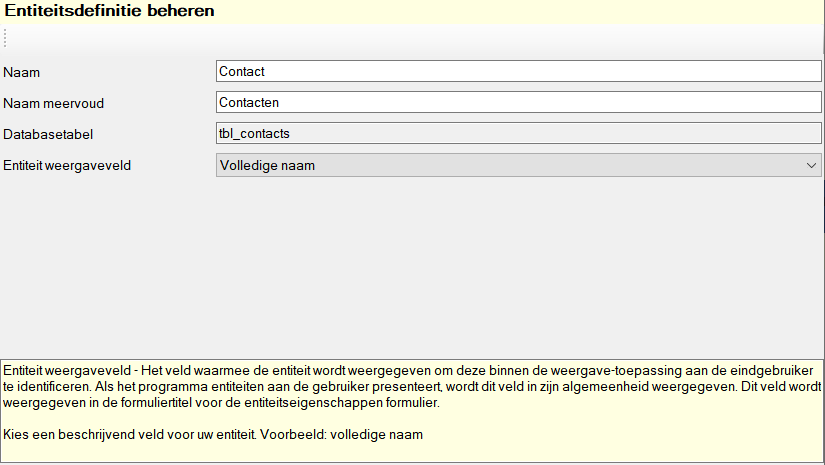 Via the entity view field you determine which entity field is used as the main designation. This means that in all places in the view application where the programme will indicate entities, this field will be used. Therefore, choose a field that clearly indicates the entity, in the case of an address book this can be the Full name of the contact.