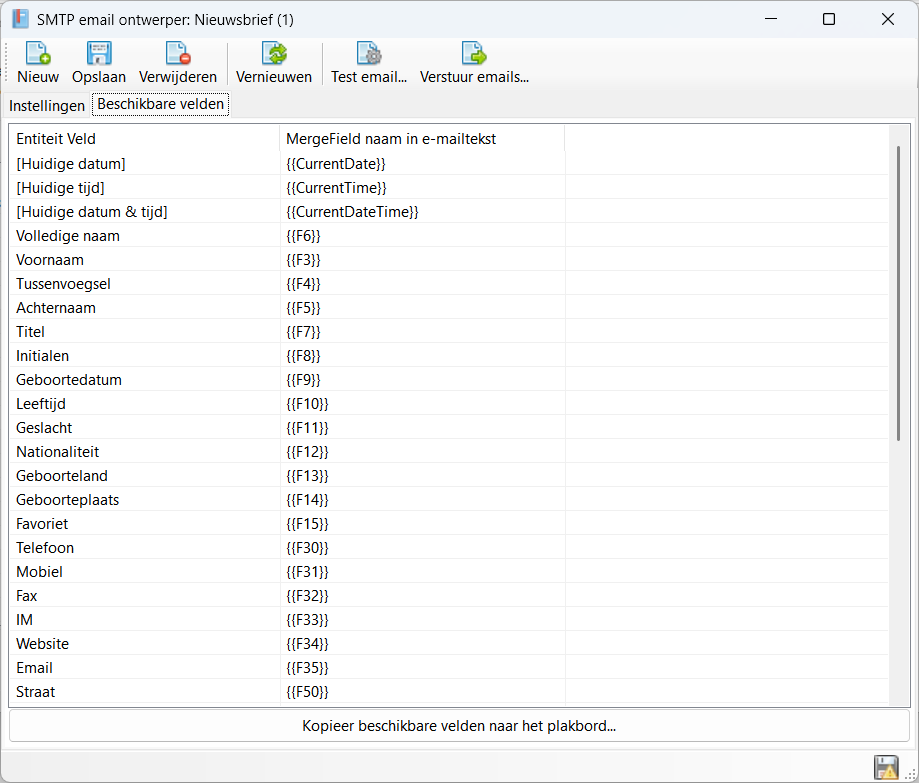 This tab gives you the different variables to use in the e-mail template. Each field {{fxx}} will be replaced with the entity's actual value when generating the e-mail.