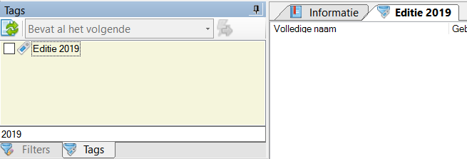 Wanneer u een flinke lijst van tags opgebouwd heeft kan het handig zijn de gewenste tag op te zoeken door de lijst kleiner te maken. Via het Tags zoeken invoerveld wordt de geselecteerde taglijst doorzocht en worden alle tags weergegeven die de gezochte tekst bevatten. In onderstaande voorbeeld wordt gezocht naar het jaar 2019.